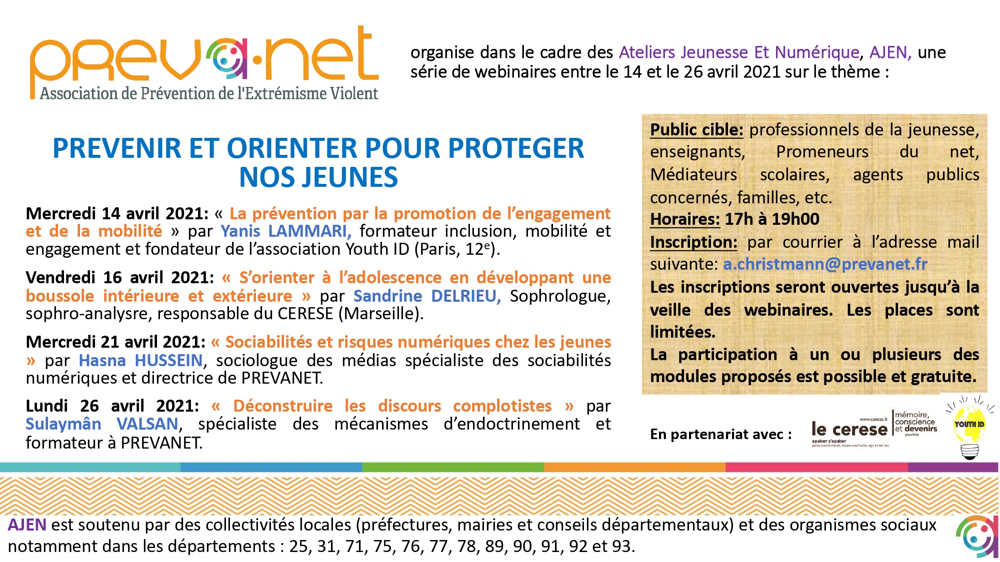 Nous avons le plaisir de vous inviter à la 5ème semaine de WEBINAIRES organisés par PREVANET entre le 14 et le 26 avril 2021 en partenariat avec Le Cerese (www.sorienter.org) et Youth ID (https://www.youthid.net/fr/-.